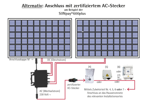 Zum einfachen Anschluss an das Hausstromnetz ist im Lieferumfang ein 5m-AC-Kabel mit vormontiertem Schukostecker. Auch wenn keine direkte gesetzliche Pflicht für die Einhaltung der VDE-Normen besteht, fordern viele Netzbetreiber einen zertifizierten AC-Anschluss, um die Anmeldung der Mini-PV-Anlage durchzuführen. In diesem Fall muss der im Lieferumfang enthaltene zertifizierte AC-Stecker eingesetzt werden. Von einer Elektrofachkraft ist der Stecker auszutauschen und eine spezielle Einspeisesteckdose, siehe Zubehör Nr. 4, 5, 6 oder 7 zu installieren.