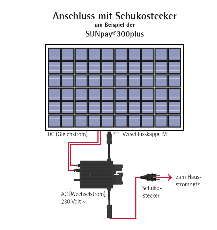 Das Solarmodul wandelt das Tages- und Sonnenlicht in Gleichstrom und der Modulwechselrichter wandelt den gewonnenen Gleichstrom in netzkonformen Wechselstrom um. Dieser wird mittels des Wechselrichters über die nächstgelegene Steckdose/Abzweigdose in das Hausstromnetz eingespeist. Somit werden die Stromkosten für die elektrische Grundlast im Haus reduziert und ein Teil des eigenen Strombedarfes im Haushalt wird eingespart.