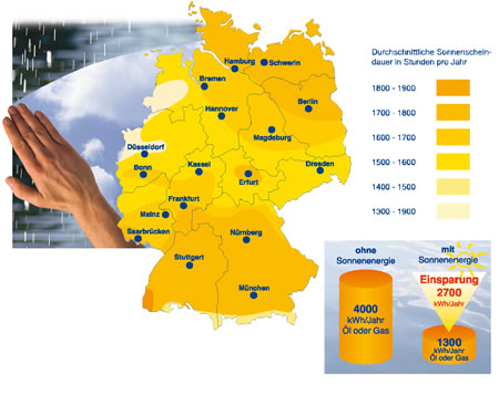 The annual solar radiation in Germany is completely sufficient for using solar energy. With a solar installation for domestic hot water, you can save up to 70% of the energy required for hot-water preparation each day - or even up to 100% in the summer period.